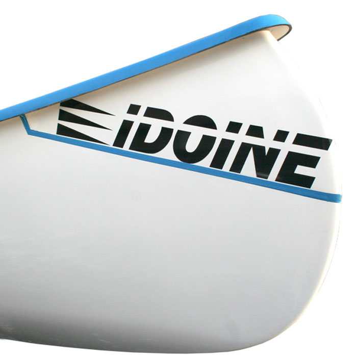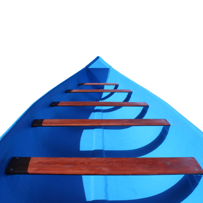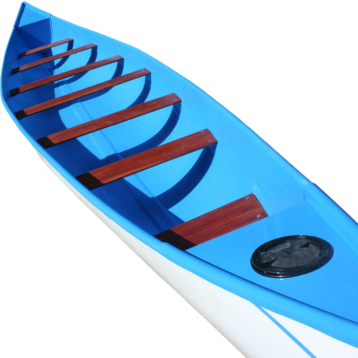 Coque en fibre de verre. Résine Isoftalic polyester. Bancs en bois Mahogany triple couche laqués.