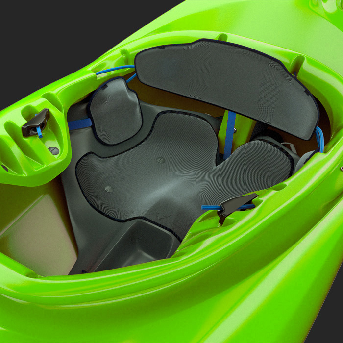 Le cale-pieds, les cale-cuisses, le siège, les cale-hanches et le dossier sont tous adaptés à l’ergonomie d’un kayakiste pour une journée infatigable sur la rivière.